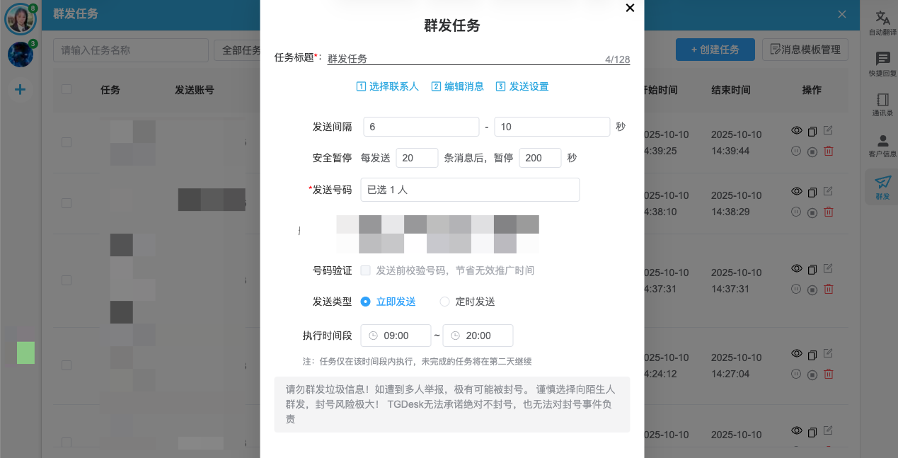 支持自定义操作时间间隔和操作频率,降低账号被封风险,保障 Telegram 账号安全。